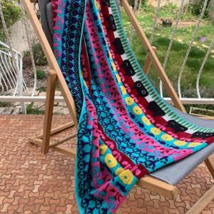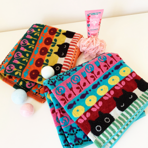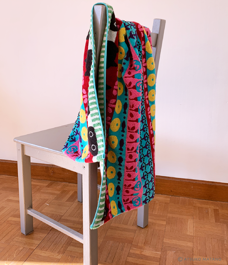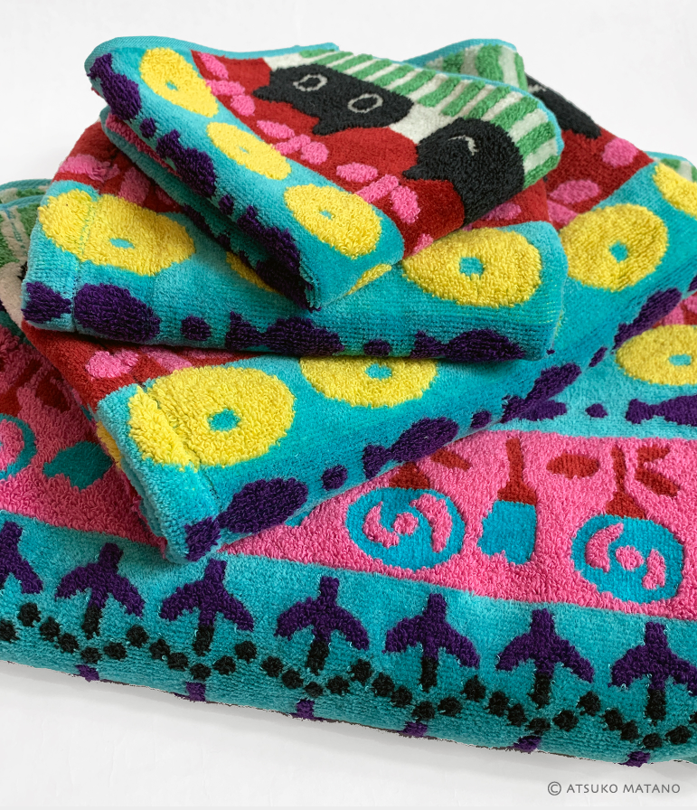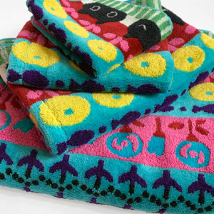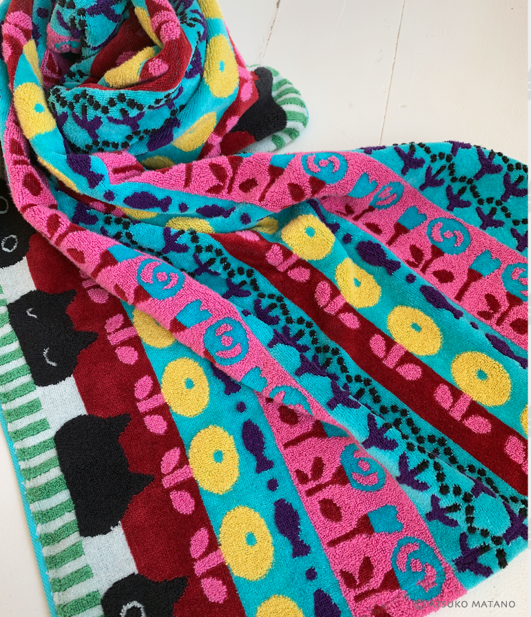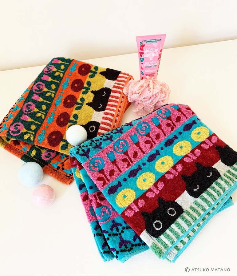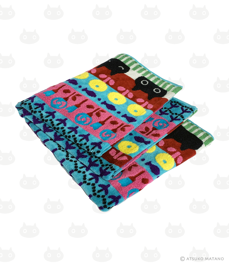 Retrouvez Mémé la féline noire dans un nouveau design avec une harmonieuse composition de motifs fleurs, poissons et de rayures dans des coloris vifs et vibrants. Tout l’esprit Kawaii d’Atsuko Matano dans une serviette en éponge douce et fluffy fabriquée au Japon.